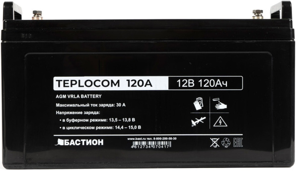Аккумулятор герметичный свинцово-кислотный необслуживаемый TEPLOCOM 120Ач производится по технологии AGM (Absorbent Glass Mat) и предназначен для использования в составе системы резервного питания.