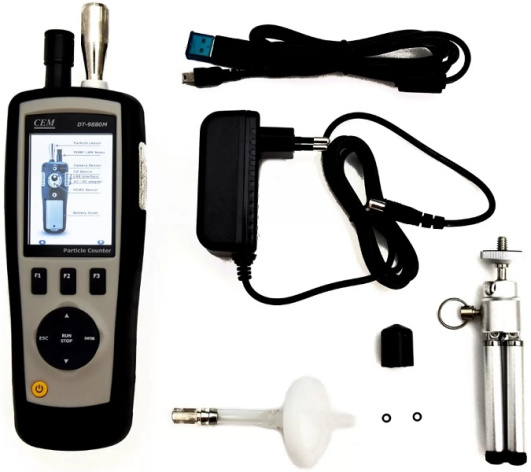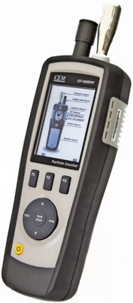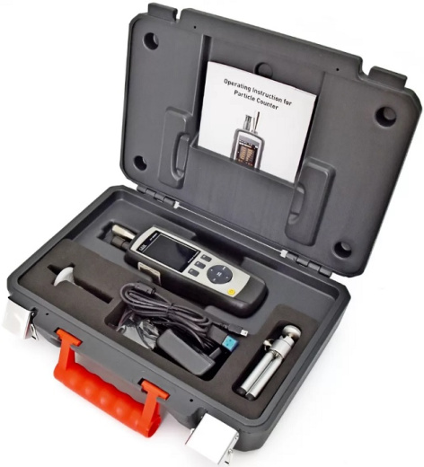 Счётчик пылевых частиц служит для быстрого измерения содержания взвешенных твердых частиц в воздухе, а так же определяет температуру и уровень влажности.
