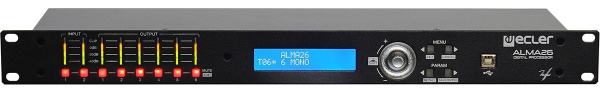 ALMA26 – цифровая матрица аудиосигналов, DSP-аудиопроцессор с фиксированной архитектурой, предназначенный для работы с акустическими системами. Задержки, 8-канальные графические эквалайзеры, фильтры, компрессоры на каждый вход. 2 линейных входа (XLR), 6 выходов (XLR).