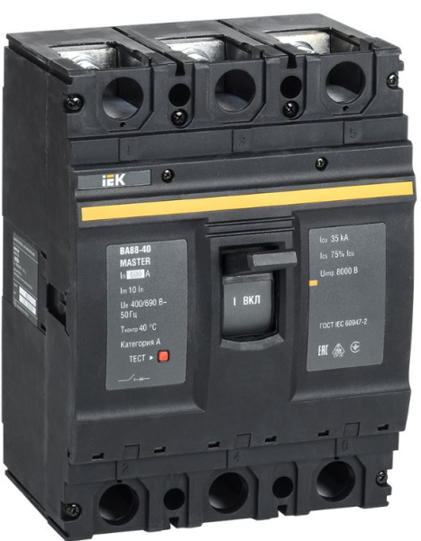 Автоматический выключатель в литом корпусе ВА88 MASTER предназначен для защиты электрических сетей от токов короткого замыкания, токов перегрузки, недопустимых снижений напряжения, а также для проведения тока в нормальном режиме. Автоматические выключатели производятся в 5 типоразмерах, оснащены термомагнитным расцепителем на токи от 16 до 800А и электронным расцепителем на токи от 125 до 800А. Рабочее напряжение 400/690 В. Конструкция автоматического выключателя предусматривает возможность самостоятельной установки дополнительных устройств на объекте заказчика.