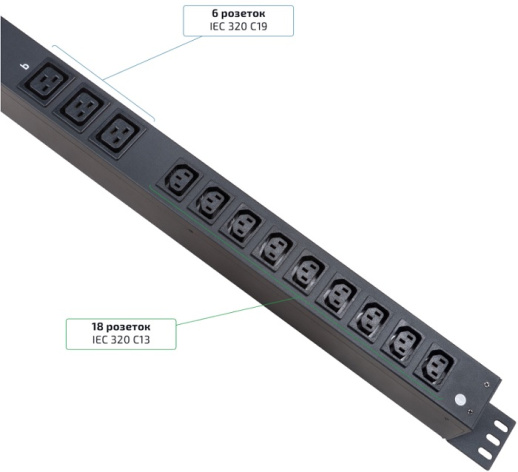 Однофазный блок электрических розеток предназначен для распределения электропитания между активным оборудованием в телекоммуникационных шкафах. Блок розеток имеет 18 розеток C13 и 6 розеток C19. Подключение к сети через промышленный разъем IEC60309. Блок поддерживает удаленный мониторинг общей нагрузки на блок.