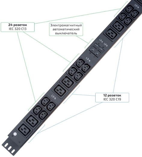 Трехфазный блок электрических розеток предназначен для распределения электропитания между активным оборудованием в телекоммуникационных шкафах. Блок розеток имеет 24 розетки C13 и 12 розеток C19. Подключение к сети через промышленный разъем IEC60309. Блок поддерживает удаленный мониторинг общей нагрузки на блок.