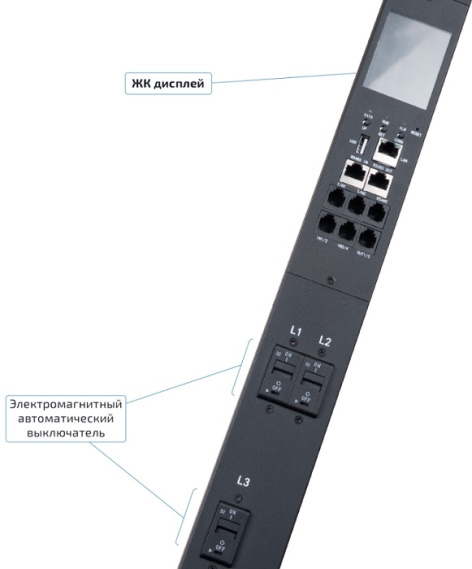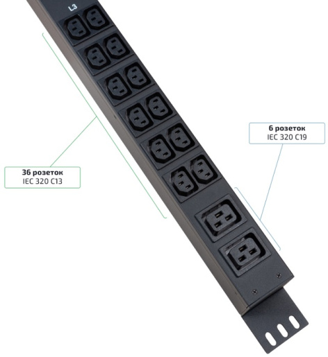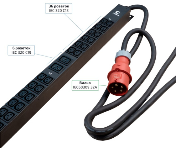 Трехфазный блок электрических розеток предназначен для распределения электропитания между активным оборудованием в телекоммуникационных шкафах. Блок розеток имеет 36 розеток C13 и 6 розеток C19. Подключение к сети через промышленный разъем IEC60309. Блок поддерживает удаленный мониторинг общей нагрузки на блок.