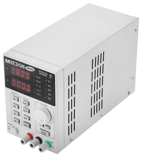 МЕГЕОН 36605 – это компактный, высокоточный, одноканальный программируемый источник питания. Выходное напряжение 0…60 В с током нагрузки 0…5 А. В источнике реализовано: программирование до 5 значений напряжения и тока (любое из пяти значений выбирается в одно нажатие), термокомпенсация, компенсация по току, подавление пульсаций и высокоэффективная программируемая защита от перегрузки по току и напряжению (OVP, OCP), и короткого замыкания на выходе.