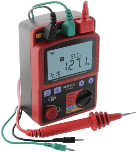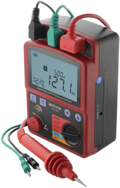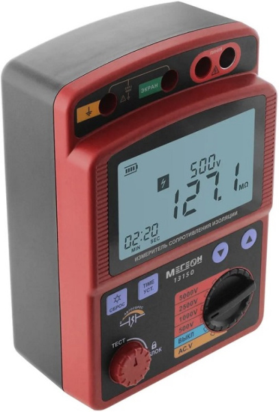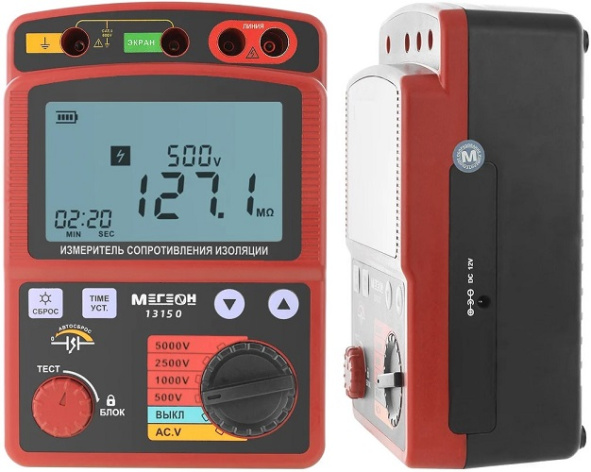 МЕГЕОН 13150 — портативный цифровой измеритель сопротивления изоляции. Изделие имеет несколько тестовых напряжений (500В, 1000В, 2500В, 5000В) и позволяет измерять сопротивление до 1 ТОм. Наличие функции измерения коэффициента поляризации расширяет спектр применения прибора. Большой высококонтрастный ЖК-дисплей с подсветкой позволит выполнять работу в условиях плохой освещенности.