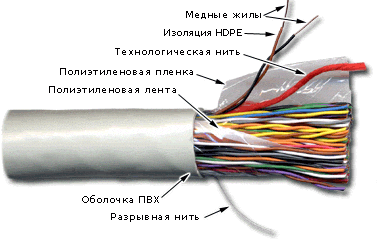 Кабель состоит из 100 пар одножильных медных проводников. Диаметр проводника 24AWG. Каждый проводник заключен в изоляцию HDPE (полиэтилен высокой плотности). Два проводника, скрученных со специально подобранным шагом, составляют одну витую пару. Витые пары собраны в пучки по 25 шт. полиэтиленовыми лентами. Пучки скреплены технологической нитью, обернуты полиэтиленовой пленкой и заключены в общую оболочку из ПВХ (PVC).Для облегчения разделки кабеля под оболочкой имеется разрывная нить.