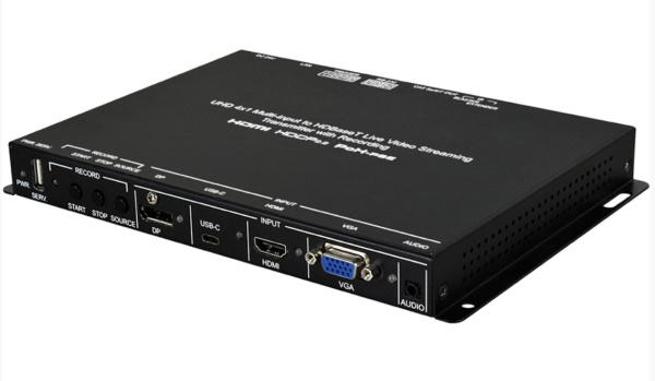 CDPS-P313RTX – передатчик по HDBaseT сигналов с разрешением до 4096x2160p/60 (при 4:2:0), по Ethernet сигналов сжатого видео H.264 разрешением до 1080p/60. Источниками являются сигналы HDMI, DisplayPort, USB-C разрешением 4096x2160p/60 (4:2:0) с поддержкой HDCP 1.4/2.2 и VGA 1920x1080p/60. Также обеспечивается передача и прием сигналов ИК по HDBaseT. Устройство может записывать контент на USB-накопитель.