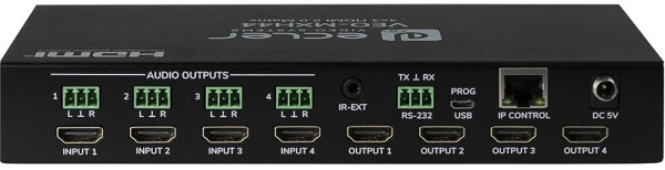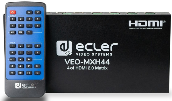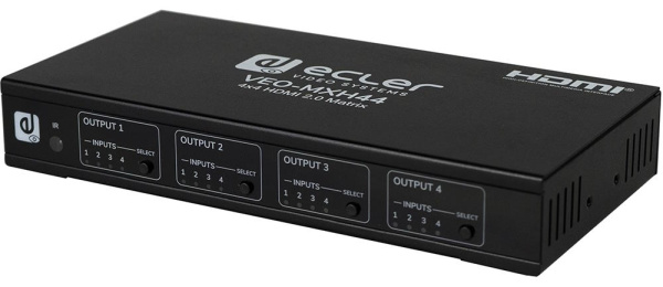 VEO-MXH44 – матричный коммутатор 4х4 сигналов интерфейса HDMI 2.0 разрешением до 4096x2160/60 (4:4:4) с поддержкой технологий HDR 10, HDCP 1.4/2.2 и расширенным набором заводских конфигураций EDID-блока. Наряду с выходными разъемами HDMI присутствуют соответствующие разъемы для деэмбеддированного сигнала стереоаудио. Полоса пропускания 600 МГц. Поддержка эмбеддированного аудио в форматах LPCM 2.0/5.1/7.1, Dolby Digital, DTS 5.1, Dolby TrueHD, DTS-HD Master Audio, Dolby Atmos. Управление прибором осуществляется по RS-232, ИК и IP (web-интерфейс).