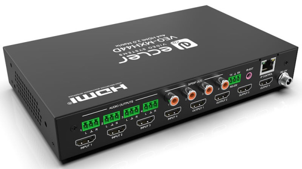 Матричный коммутатор 4х4 ECLER VEO-MXH44D для определения источника трансляции HDMI 2.0. Четыре (4) входа и четыре (4) выхода HDMI. Параметры сигнала - разрешение до 4К/60 (UHD, HDR 10, Dolby Vision, HLG, HDCP 2.2). Конфигурации EDID настроены производителем в нескольких вариантах (8 пресетов).