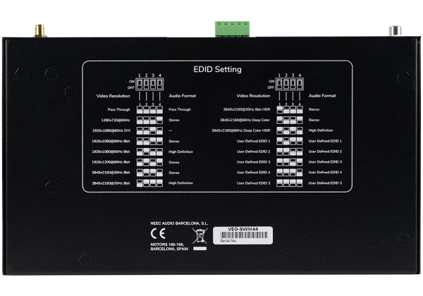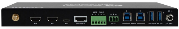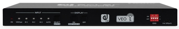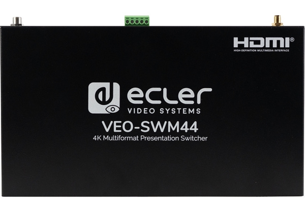 VEO-SWM44 – презентационный коммутатор 4х1 со входами 2хHDMI 2.0, USB-C и антенной VEOCast для подключения мобильных устройств. Входное и выходное разрешение сигналов до 4K/60 (4:4:4) с поддержкой технологий HDCP 2.2, CEC, HDR 10. Полоса пропускания устройства 600 МГц. Есть выход стереоаудио для деэмбеддированного сигнала стереоаудио. Управление устройством осуществляется по RS-232.