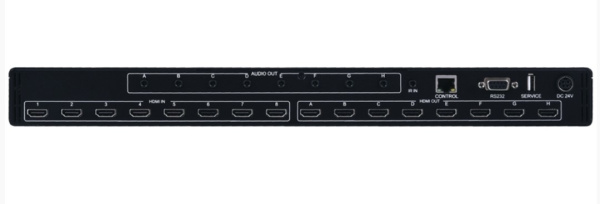 CPLUS-V8H8HPA – матричный коммутатор 8х8 сигналов интерфейса HDMI 2.0 разрешением до 4096x2160/60, (4:4:4) с поддержкой технологии HDR, HDCP 1.4, 2.2 и расширенным набором заводских конфигураций EDID-блока. Наряду с выходными разъемами HDMI присутствуют соответствующие разъемы стереоаудио (8х miniJack 3,5 мм). Полоса пропускания 600 МГц.