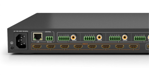 WyreStorm MX-0808-H2A-MK2 оснащен HDMI выходами понижающими масштабаторами, которые скалируют сигнал 4K до 1080p, что упрощает интеграцию дисплеев со смешанным разрешением в единую систему. Выходы HDMI теперь также поддерживают Audio Return Channel от смарт-телевизоров для передачи звука из таких приложений, как Netflix, Prime Video, Hulu и т.п. на внешнюю аудиосистему.Аудио. Аналоговые аудиовыходы были обновлены до балансных соединений, что гарантирует отсутствие помех или потери точности.