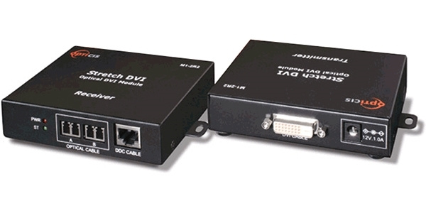 M1-2R2-TR – комплект устройств для передачи сигнала DVI по линии из четырех многомодовых оптоволокон для графических данных TMDS и кабелю витой пары для сервисных сигналов DDC 2B, HDCP. В передающем и принимающем модулях для подключения оптоволоконных кабелей используются сдвоенные разъемы LC, для витых пар – разъемы RJ45.