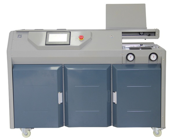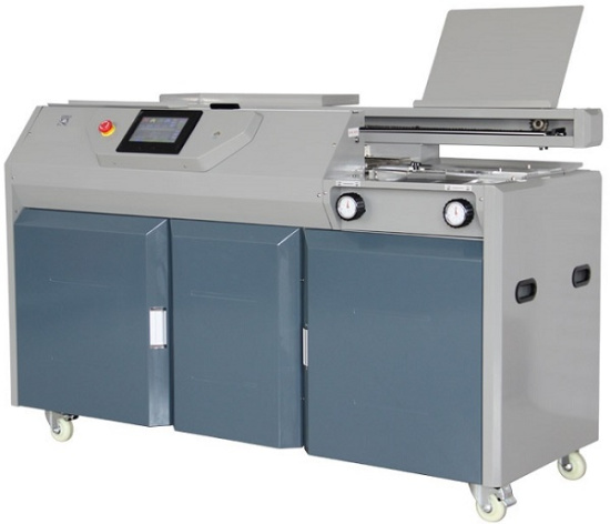 Автоматический термопереплётчик А3 (ролики боковой проклейки, торшонирование и фреза). В качестве обложки можно использовать любой материал: бумагу или картон от 40 до 400 г/м2, комбинированную обложку из ПВХ пленки и картона, для скрепления листов в мягкую или жёсткую обложку. Профессиональная термоклеевая машина G65 идеально подходит для использования как в типографиях, так и в крупных учреждениях, имеющих потребность в изготовлении брошюр, буклетов и других видов книжно-журнальной продукции в больших объёмах. Высокая скорость работы.