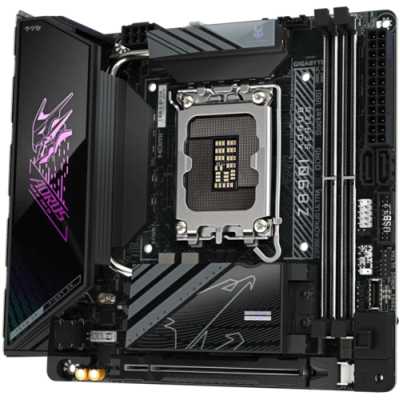 Материнская плата производства компании GigaByte форм фактора mini-ITX. На M/B интегрировано: 2 слота памяти DDR5 DIMM объемом вплоть до 128 Гб, беспроводной сетевой адаптер Wi-Fi, Bluetooth, 7.1CH ; Предусмотрено: установка до 2 PCI-E 16x устройств, подключение до 2 твердотельных накопителей типа М2 и до 2 дисковых HDD SSD накопителей, интерфейсы для подключения внешних устройств: RJ45 (LAN) - 1шт., USB 2.0 - 1шт., USB 3.2 - 6шт., S/PDIF - есть, Thunderbolt - 1 шт.