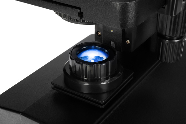 Нижнее расположение подсветки служит работе в проходящем свете. Конденсор – классический Аббе, с ирисовой диафрагмой премиального уровня. Так как присутствует и полевая диафрагма, микроскоп позволяет настраивать освещение по методу Кёлера. В качестве источника света используется галогенная лампочка. Она обеспечивает «теплое» освещение с минимумом мерцания, поэтому не только создает хорошо освещенное рабочее поле, но и не нагружает излишне зрение. Подсветка работает от сети. При необходимости для освещения образца можно использовать зеркало – оно включено в комплектацию. Повысить контраст картинки можно при помощи светофильтров, которые тоже есть в комплекте.