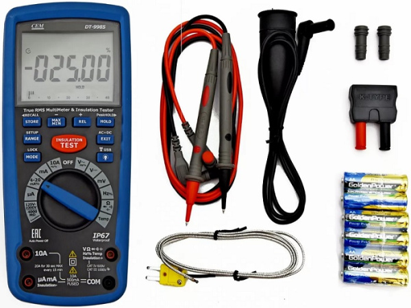 Измеритель сопротивления изоляции с True RMS мультиметром СЕМ DT-9985 481127 имеет прочный водонепроницаемый корпус, который соответствует степени защиты IP67. Благодаря защите от перегрузок по стандартам CATIII 1000V и CATIV 600V модель отличается безопасностью применения. Для измерения температуры в комплект поставки входит термопара типа К.