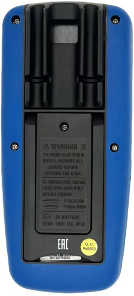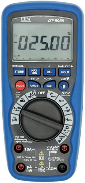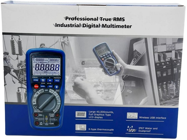 Мультиметр с беспроводным USB интерфейсом имеет двойной корпус из пластика для защиты оператора от удара током, а так же самого прибора от промокания (соответствует стандарту IP67). Внутренняя память модель вмещает до 9999 значений. Подсвечиваемый дисплей гарантирует простое и комфортное считывание результатов измерений.