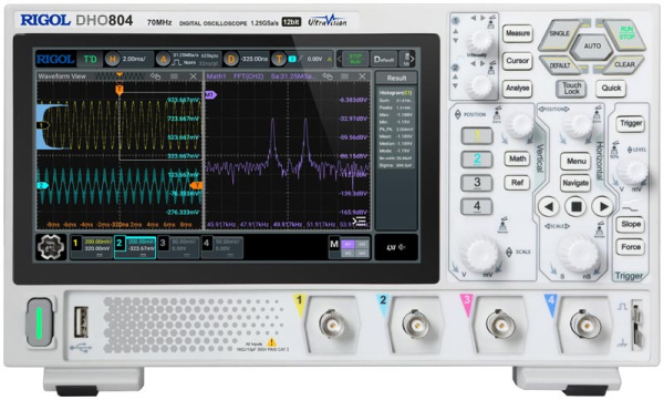 4 аналоговых канала. Максимальная полоса пропускания 70 МГц. Частота дискретизации 1,25 Гвыб/с (625 Мвыб/с на 2 канала, 312,5 Мвыб/с на 4 канала). Максимальная память 25 М точек. АЦП 12 бит. Скорость захвата 30000 осц/сек (векторное), 1000000 осц./сек (UltraAcquire). Анализ осциллограмм (до 500000 кадров). Расширенная синхронизация (15 типов штатно). Декодирование протоколов RS-232/UART, I2C, SPI. 41 тип автоизмерений. Математические функции. Статистика. БПФ. Цифровой вольтметр. Частотомер. Операционная система Android. Интерфейс: USB-host, USB-device, LAN (c LXI-C), HDMI. Дисплей: 7", цветной, сенсорный, 1024 х 600. Вес: 1,78 кг. Размеры: 265,35 x 161,75 x 77,38 мм.