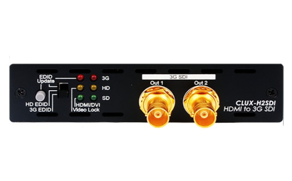 CLUX-H2SDI – преобразователь сигналов интерфейса HDMI 1.3 в SD/HD/3G-SDI. Позволяет преобразовывать видеосигнал с HDMI источника в сигналы интерфейса SDI на выходе. Поддерживает форматы высокой четкости с разрешениями до 1080p. Преобразователь снабжен на выходе распределителем сигнала SDI 1:2. Сформированный сигнал перетактируется.