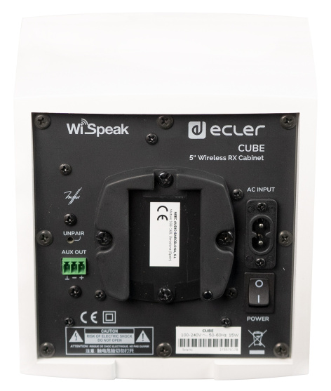 ECLER CUBE (white) – 2-полосная акустическая система приемник беспроводной аудиосистемы системы WiSpeak, предназначенная для построения радиоканальных систем озвучивания, оповещения и конференц-связи. Она оборудована 5" НЧ вуфером и 1 " ВЧ твитером, которые обеспечивают мощность на уровне 32 Вт и чувствительность 83 дБ в частотном спектре 70 Гц – 20 кГц. Сигналы управления и аудио получает от передатчика CORE по радиоканалу. При этом расстояние между приборами не должно превышать 12 м (в условиях прямой видимости).