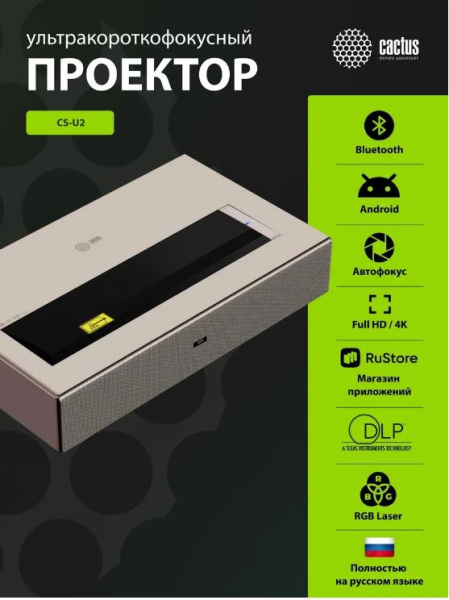 Проектор Cactus CS-U2.WT обладает высокой яркостью 19000Lm (800Lm ANSI), что позволяет использовать его даже в ярко освещенных помещениях. Это обеспечивает четкое и яркое изображение, независимо от условий освещения. Устройство поддерживает разрешение 1920x1080, что обеспечивает высокое качество изображения. Благодаря этому, вы сможете наслаждаться четким и детализированным изображением, что особенно важно при просмотре фильмов и видеоигр.