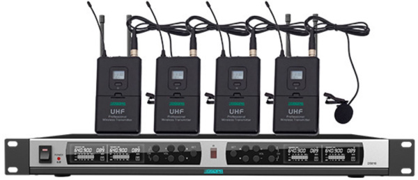 Беспроводной приемник с 4-мя микрофонами типа "петличка", Четырехканальный дизайн PLL, Функция автоматической связи с цифровой блокировкой PLL канала UHF200, С экраном дисплея (для отображения частоты, канала, шумоподавления, уровня и т.д.), С регулятором громкости для каждого канала, Выход автофокусировки (с использованием разъемов XLR для раздельного вывода и смешанного вывода).