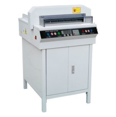 Bulros 450VSplus — автоматический гильотинный резак. Цифровой дисплей показывает местоположение затла (заднего упора для листов) с высокой точностью, благодаря чему можно проверить подобранные размеры. Оснащен удобным и простым в эксплуатации пультом управления, шаг измерения 0,1 мм и позволяющим управлять перемещением затла в автоматическом режиме. На пульте управления имеется цифровая клавиатура для ввода параметров (координат) реза. LED дисплей. Модель имеет электрический привод реза и прижима. Высокая точность работы механизма управления бумагой. Использование червячного редуктора с плавным перемещением и низким уровнем шума. Стабильно и надежно работает при интенсивных нагрузках. Высокотехнологичная интегральная схема цифрового управления для обеспечения высокоэффективной работы. Несколько степеней защиты для обеспечения полной безопасности. Дисковый тормоз с мгновенной остановкой и обратным ходом ножа из любой позиции. Прозрачные защитные экраны из ударопрочного пластика со специальной системой блокировки ножа. Быстро заменяемое острое и прочное стальное лезвие. Автодиагностика при включении. Световой прицел для выделения линии реза, что значительно упрощает работу.Модель укомплектована тумбой.