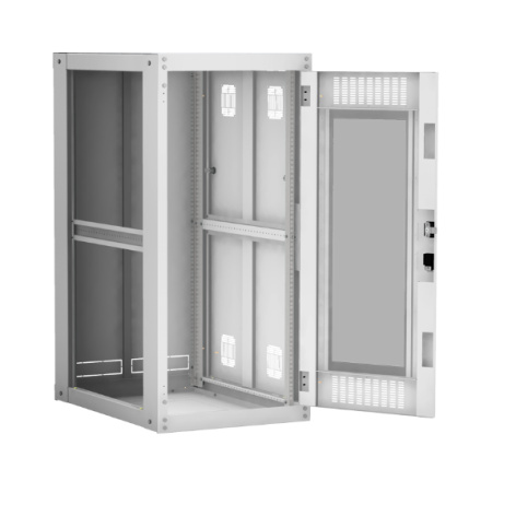 Шкаф представляет собой металлическую, сборно-разборную конструкцию, в основе которой разборный несущий каркас, состоящий из: двух передних и задних стоек, верхних и нижних передних и задних перемычек, четырех боковых и двух центральных перемычек. Наличие у шкафа двери с углом открытия 180 градусов и съемных боковых панелей и задней панели, предоставляет доступ для установки и обслуживания оборудования с четырех сторон.