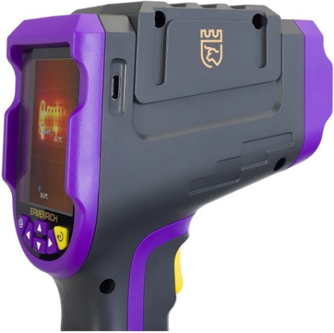 Ermenrich Seek TV70 – строительный тепловизор для обследования электрического и теплового оборудования, поиска неисправностей, утечек тепла в фасадах и фундаментах зданий. Главный элемент прибора – тепловизорный модуль 120x90 пикс с камерой 1 Мпикс, что позволяет считывать изменения температуры в диапазоне от –20 до +400 °С. Доступные режимы отображения: видимый свет, инфракрасный свет, а также режим наложения видимого и инфракрасного спектров и слияние краев. Присутствует функция <картинка в картинке>. Изображение отображается на цветном экране с разрешением 240x320 пикс. Доступно 8 цветовых палитр. Замеры температуры можно фиксировать с помощью фото или видео, сохраняя результаты на встроенную карту памяти прибора. Источник питания – литиевая батарея емкостью 2600 мАч. Одного заряда хватает на 4 часа непрерывной работы. Прибор оснащен индикатором низкого уровня заряда и функцией автоматического отключения. Заряжается тепловизор с помощью кабеля USB Type-C (идет в комплекте).