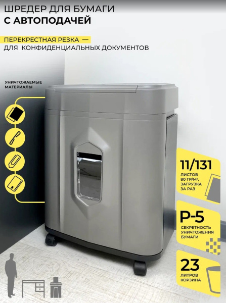 Автоподача до 131 листа 80г/м2. Время уничтожения - 3-4 мин.