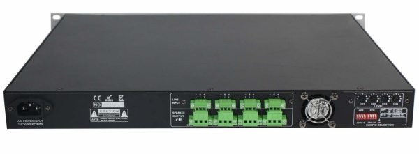 QAA PD460V2 – четырехканальный усилитель мощности класса D, 4х60 Вт – 100 В. Устройство имеет защиту от короткого замыкания. Доступны регулировка чувствительности и обрезной фильтр нижних частот на каждом канале усиления. Балансные входы.