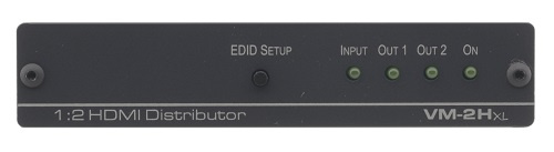 Kramer VM-2Hxl — высококачественный усилитель-распределитель 1:2 для сигнала HDMI. Он выполняет перетактирование сигнала и компенсацию АЧХ кабеля, после чего выдает сигнал на два одинаковых выхода.
