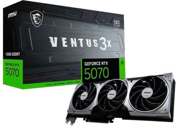 Игровая видеокарта MSI GeForce RTX 5070 VENTUS 3X без подсветки оснащена тремя кулерами и металлической пластиной для ускоренного охлаждения поверхности. 12 ГБ памяти GDDR7 хватает для одновременной работы четырех мониторов и просмотра видео в формате 8K Ultra HD без торможения и зависания. Поддержка трассировки лучей делает более естественной прорисовку света и теней для реалистичности игровой графики.